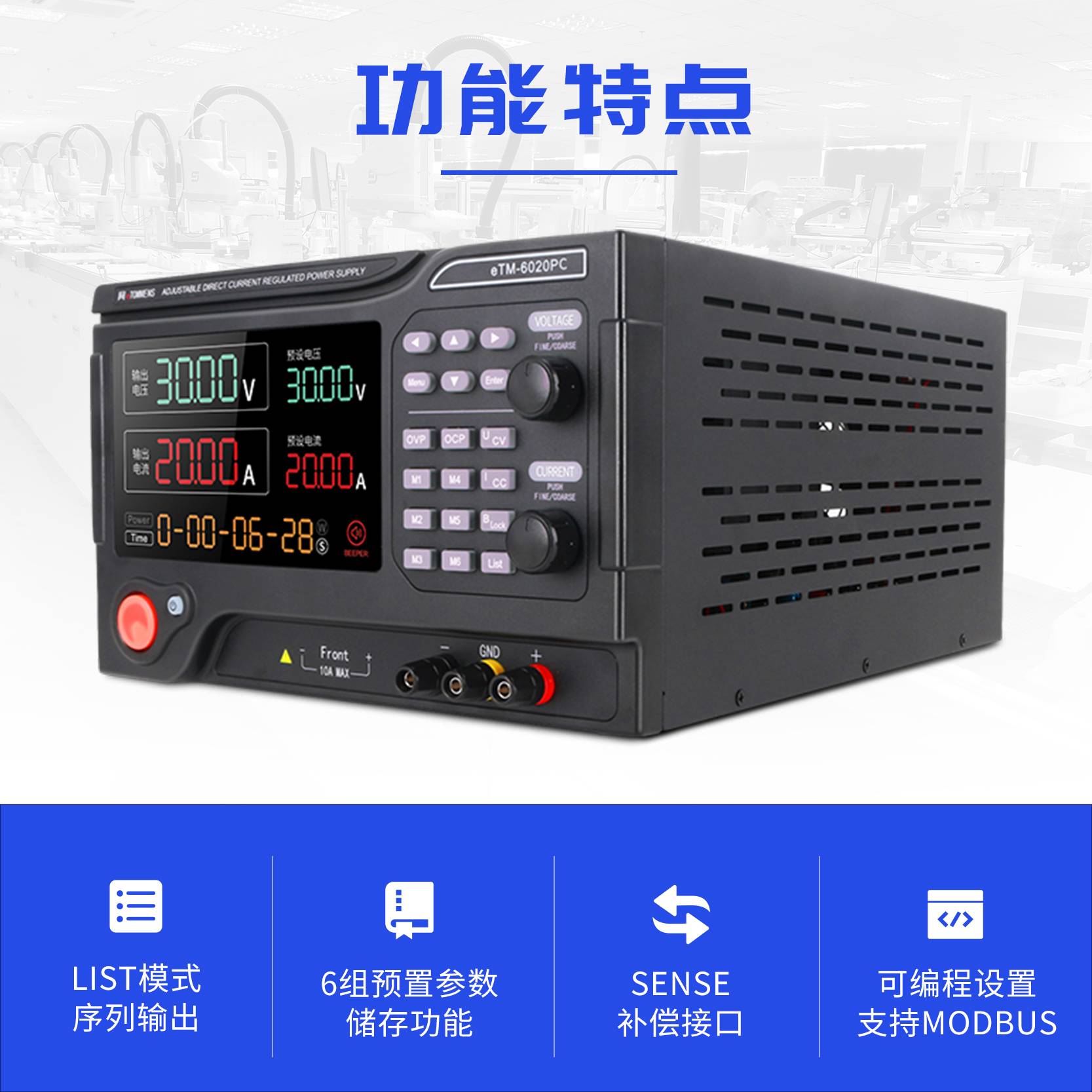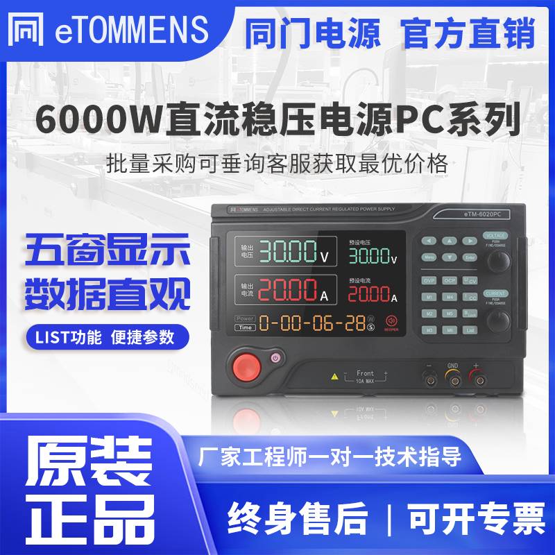 同门6000W可编程直流稳压电源四窗数据显示,运行状态一目了然。6组便捷储存参数,实现快速调用。List序列输出功能。具备SENSE补偿功能,有效减少线损导致的压降。具备10mV/10mA分辨率;具备短路、过压、过流、过功率、反极性保护功能。输出效率高,一键控制输出通断开关。