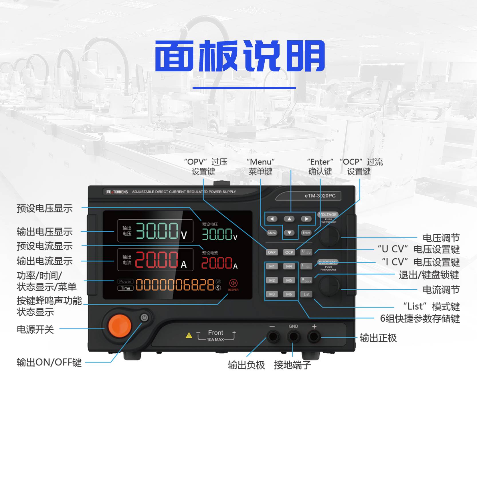 同门6000W台式电位器款直流稳压电源四窗数据显示,运行状态一目了然。电位器操作,电压电流调节方便编辑。具备SENSE补偿功能,有效减少线损导致的压降。具备10mV/10mA分辨率;具备短路、过压、过流、过功率、反极性保护功能。输出效率高,一键控制输出通断开关。 -