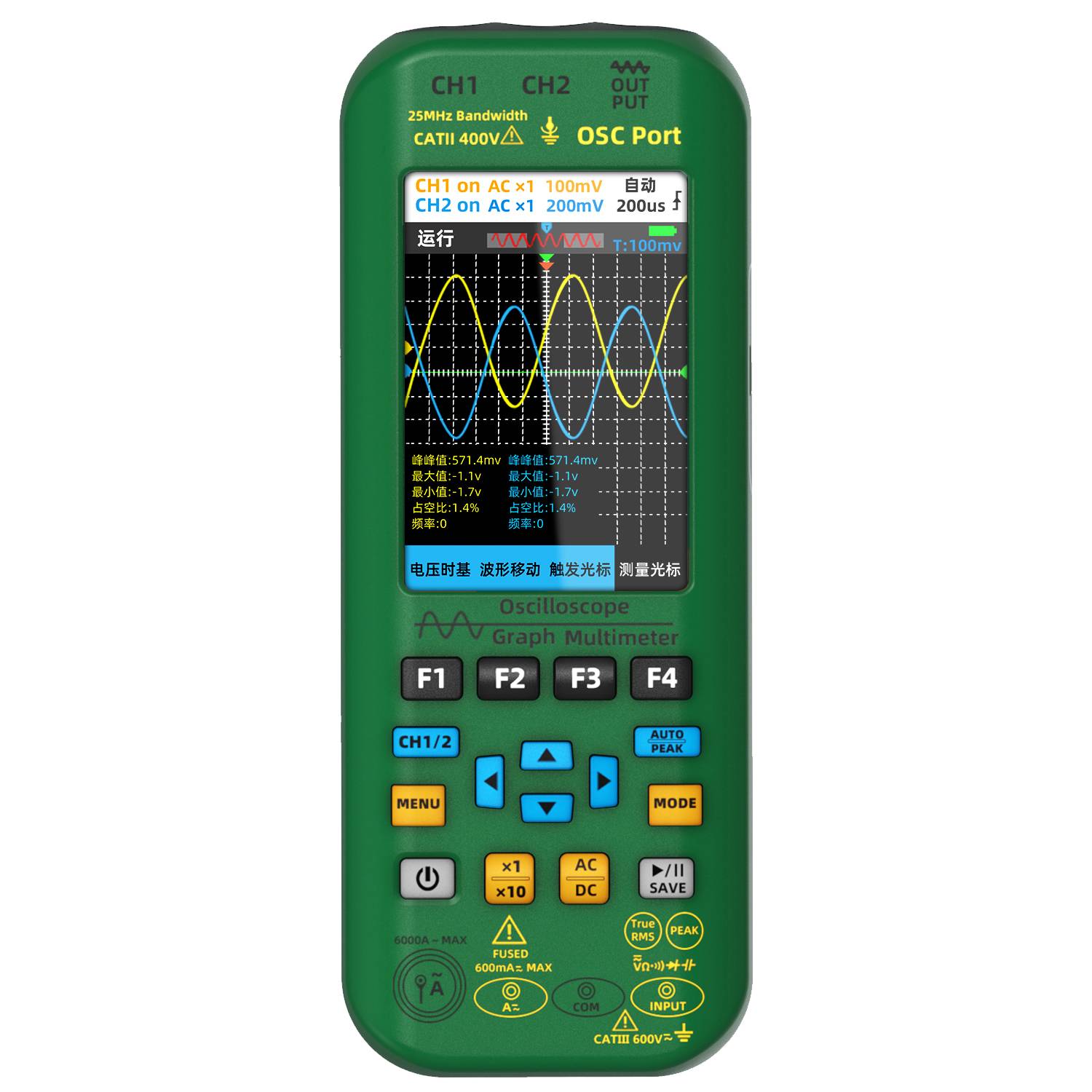 图像示波万用表BSIDE-O7宽带:50MHz 通道:2 实时采样率:250MSa/s 显示屏:TFT彩屏 最大显示值:6000数字 功能:交直流电压/交直流电流(mA)/电容/ 电阻/温度/通断/二极管/交流电流