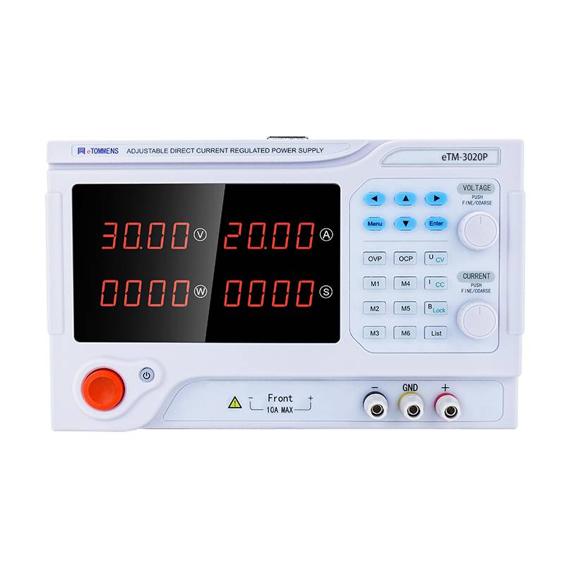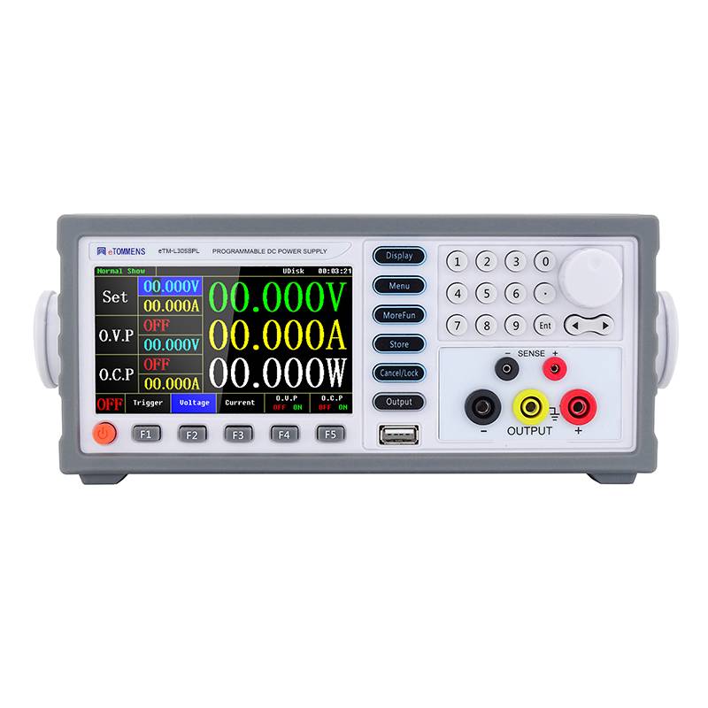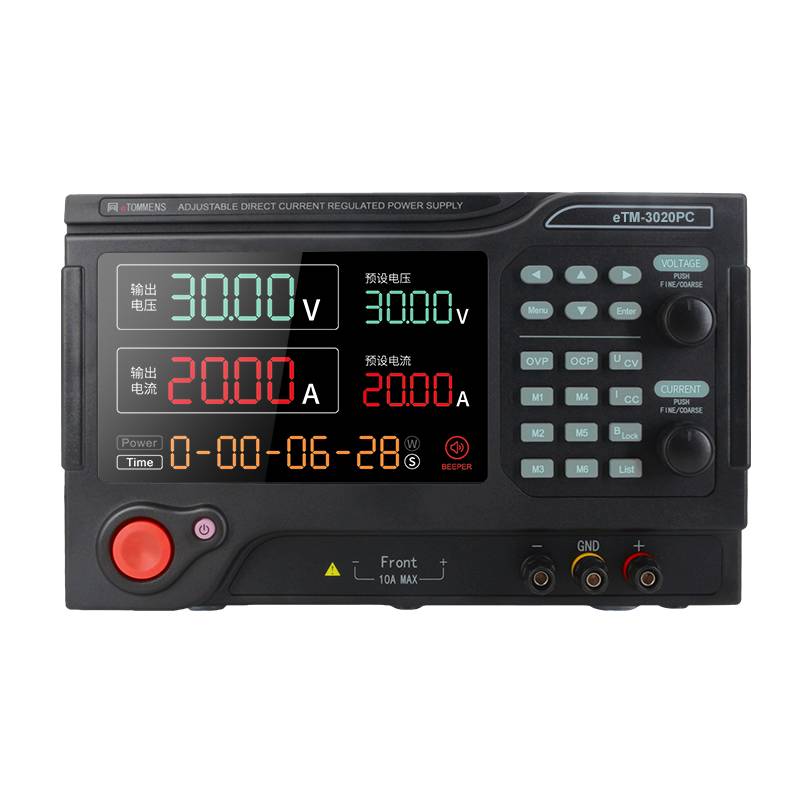同门6000W可编程直流稳压电源四窗数据显示,运行状态一目了然。6组便捷储存参数,实现快速调用。List序列输出功能。具备SENSE补偿功能,有效减少线损导致的压降。具备10mV/10mA分辨率;具备短路、过压、过流、过功率、反极性保护功能。输出效率高,一键控制输出通断开关。